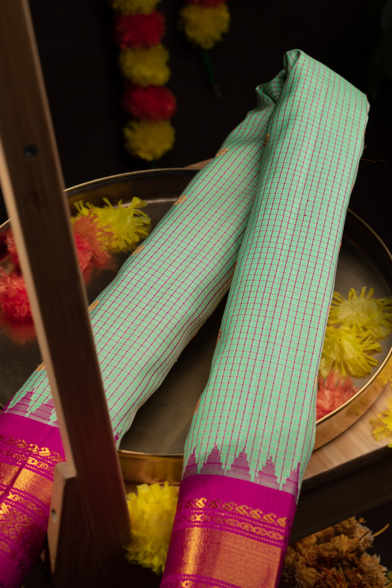 Mandir Pista Green & Magenta Gadwal Checks And Buttis Saree
