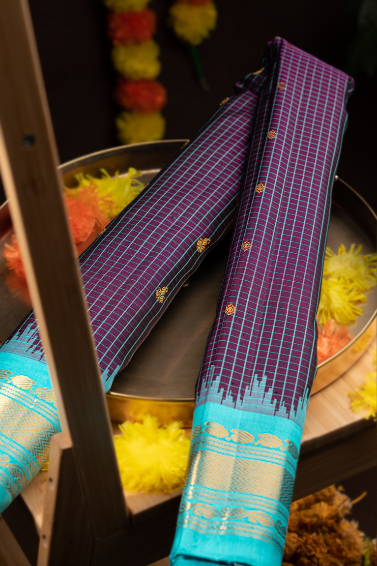 Mandir Purple & Sea Blue Gadwal Checks And Buttis Saree