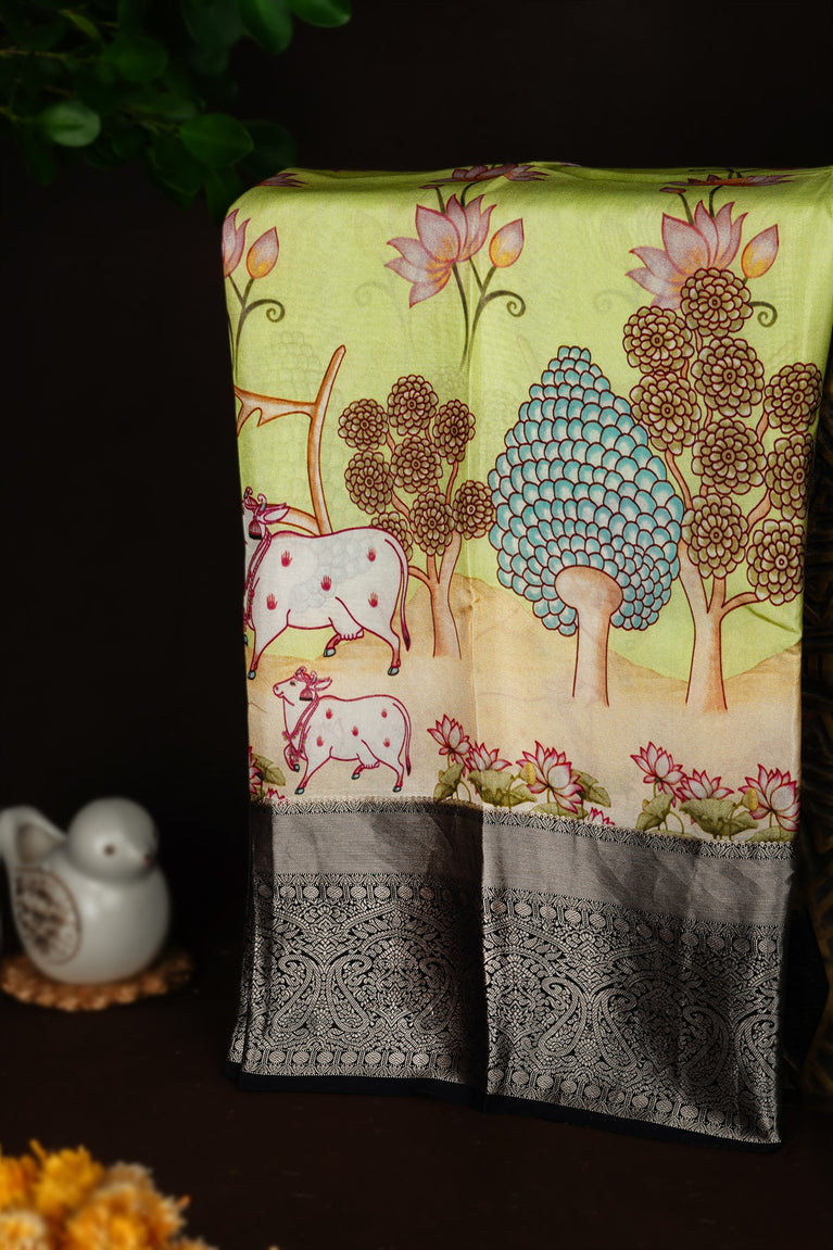 Mandir Pista Green & Black Fancy Digital Print Saree