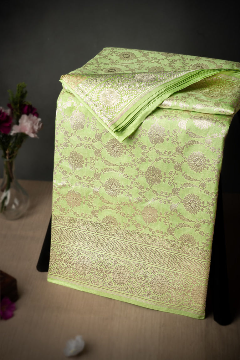 Mandir Pista Green & Silver Banarasi Jaal Saree