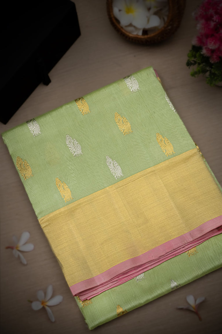 Mandir Pista Green & Blush Pink Uppada Buttis Saree