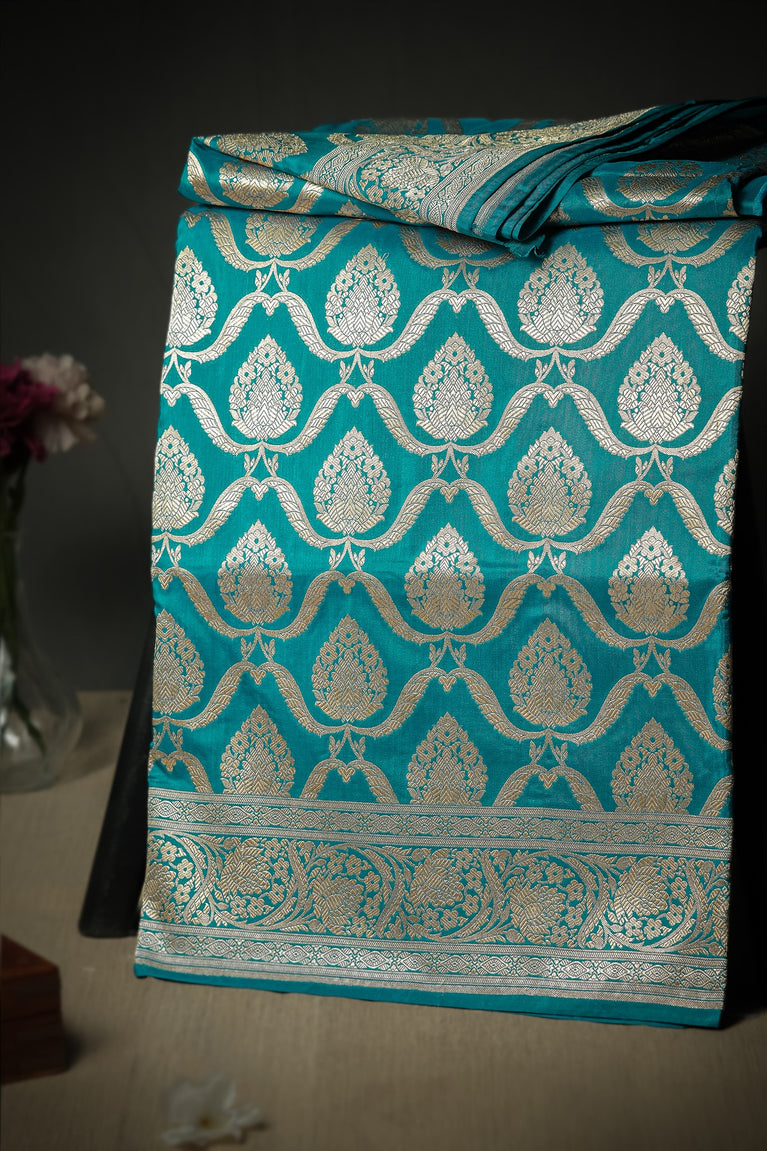 Mandir Rama Blue & Gold Banarasi Floral Jaal Saree