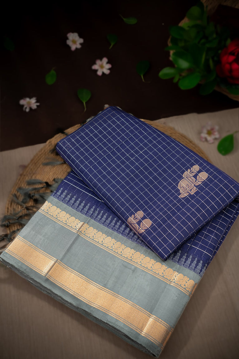 Mandir Navy Blue & Graphite Grey Kuppadam Checks And Buttis Saree