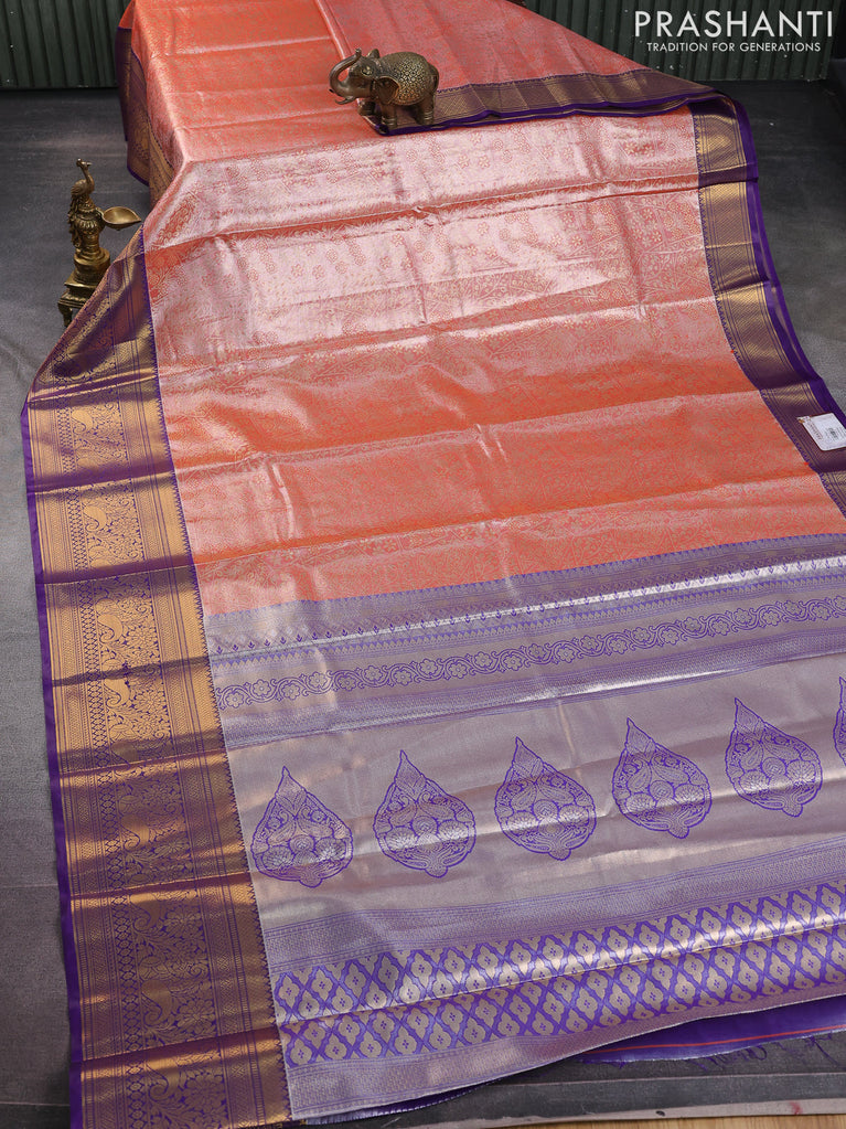 Bangalori tissue silk saree mild peach pink and violet with allover zari woven brocade weaves and long zari woven border