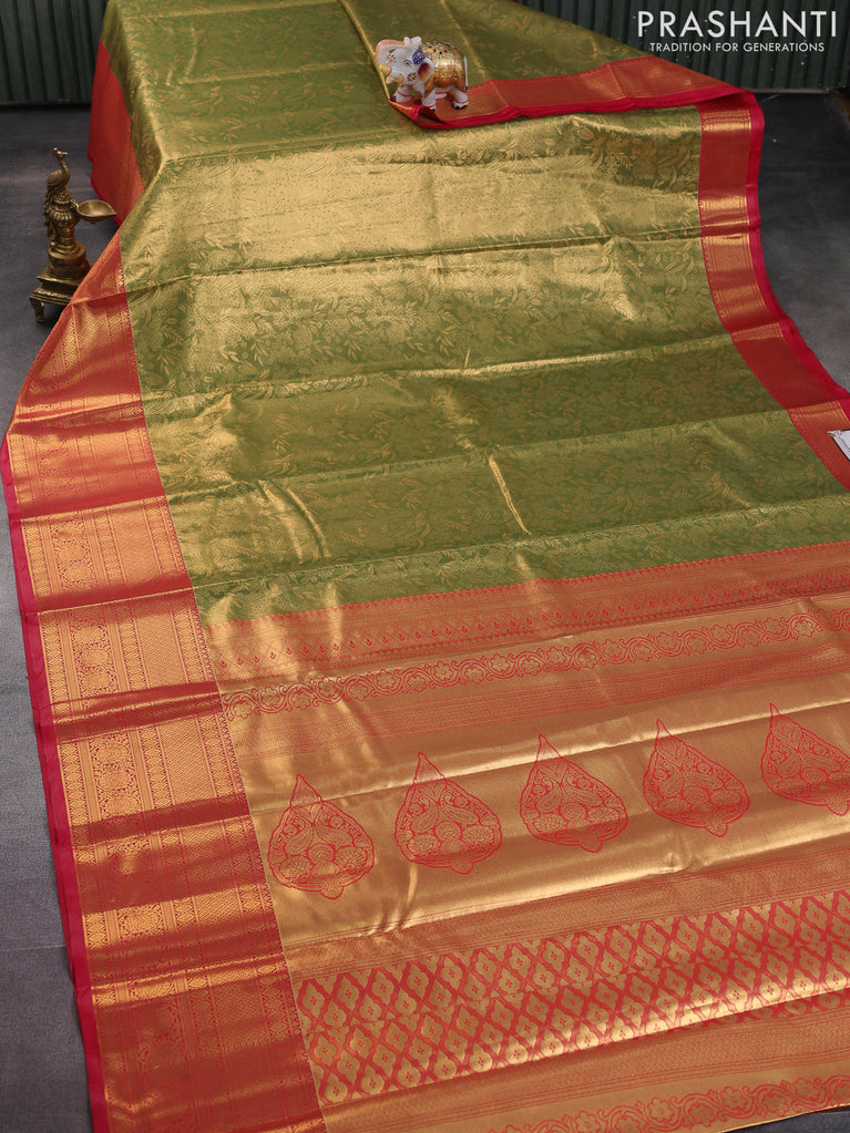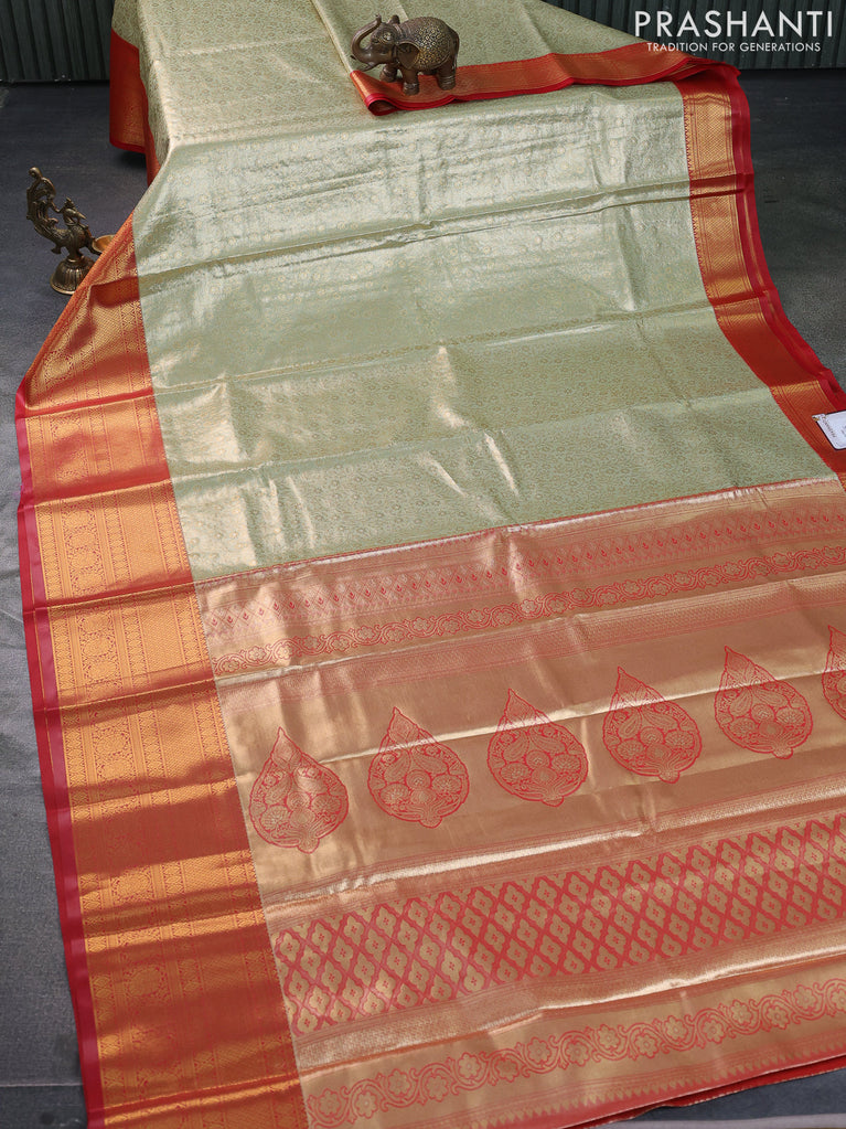Bangalori tissue silk saree pista green and red with allover zari woven brocade weaves and long zari woven border