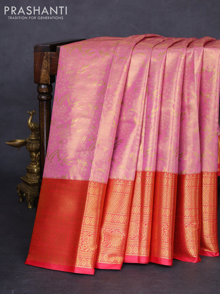 Bangalori tissue silk saree lavender and reddish pink with allover zari woven brocade weaves and long zari woven border