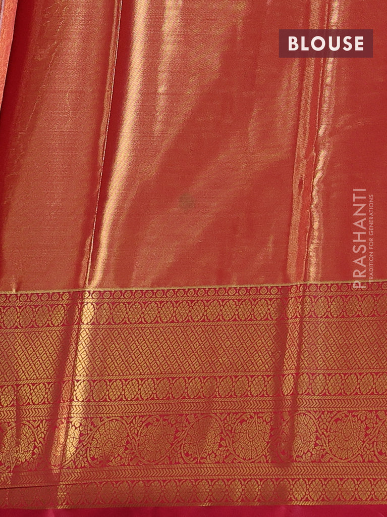 Bangalori tissue silk saree peach pink and red with allover zari woven brocade weaves and long zari woven border