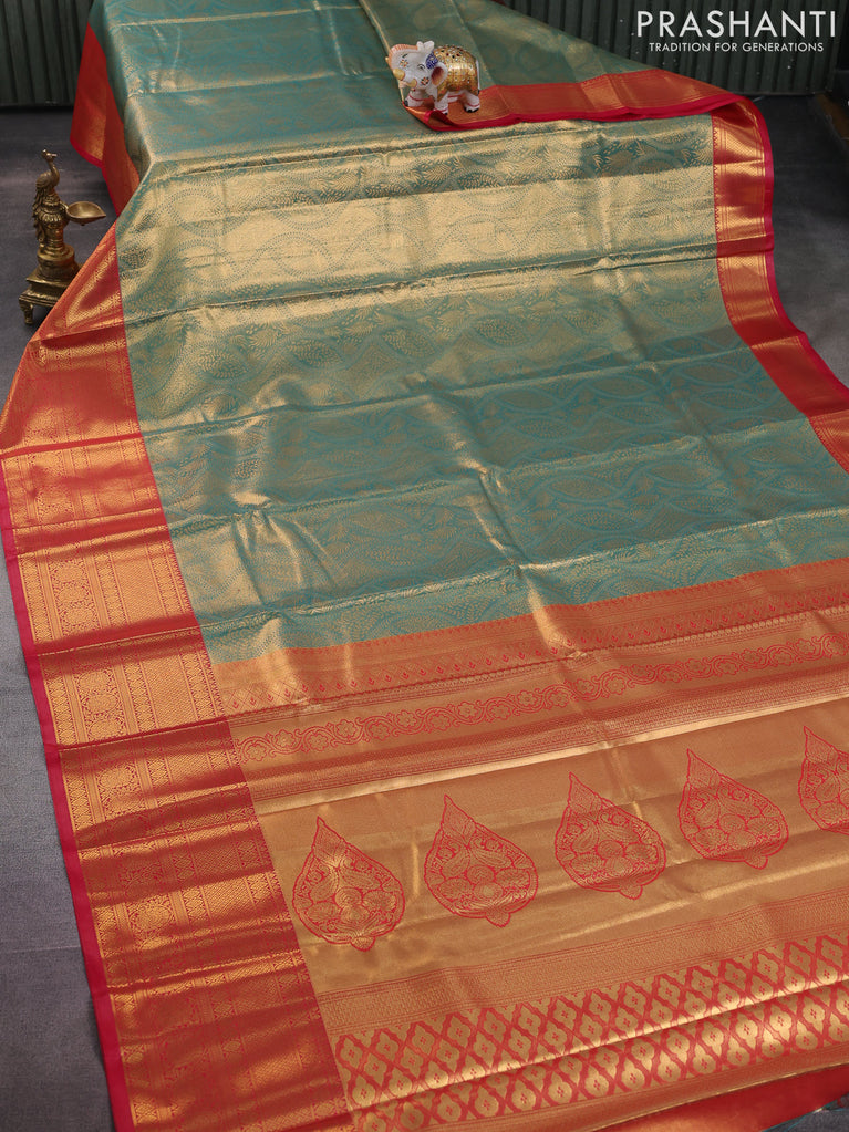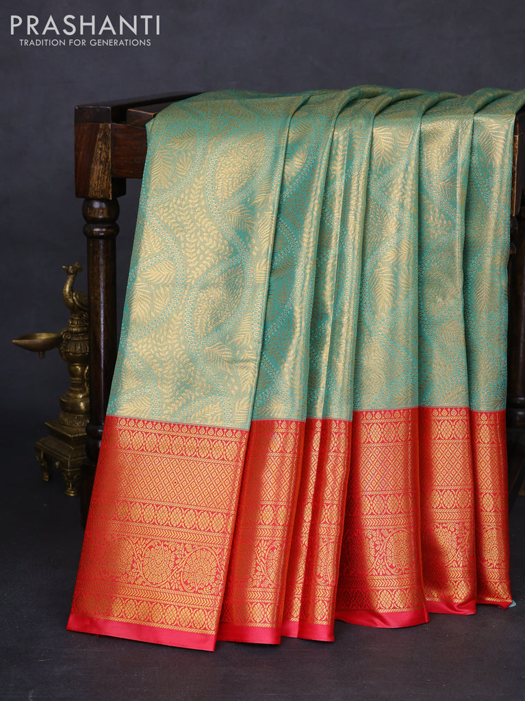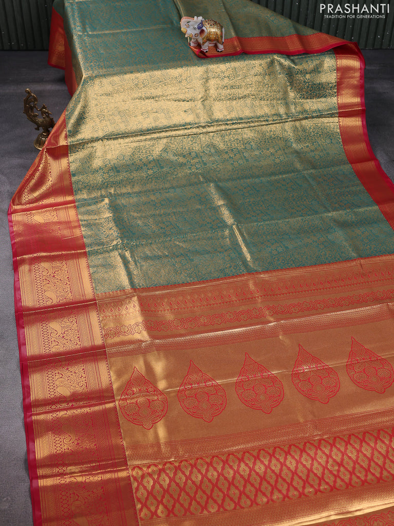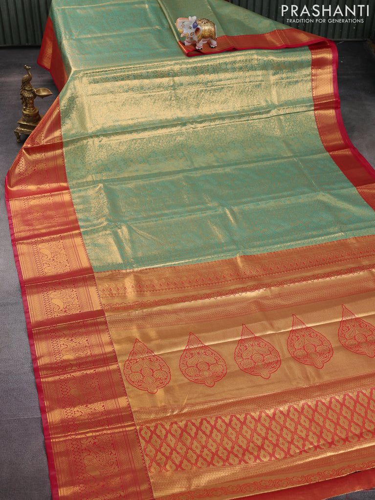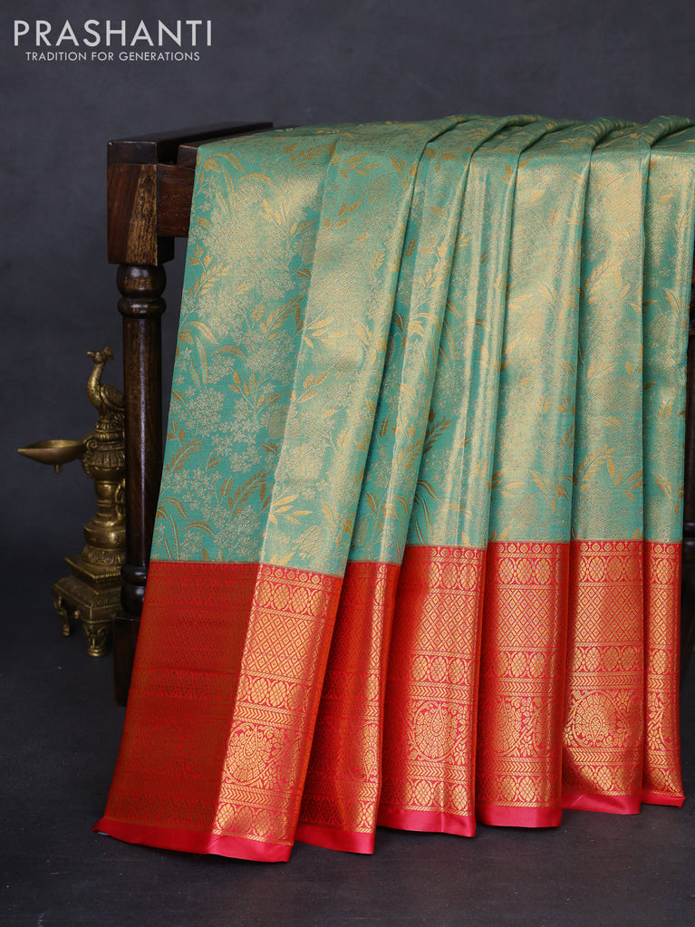 Bangalori tissue silk saree teal green and red with allover zari woven brocade weaves and long zari woven border