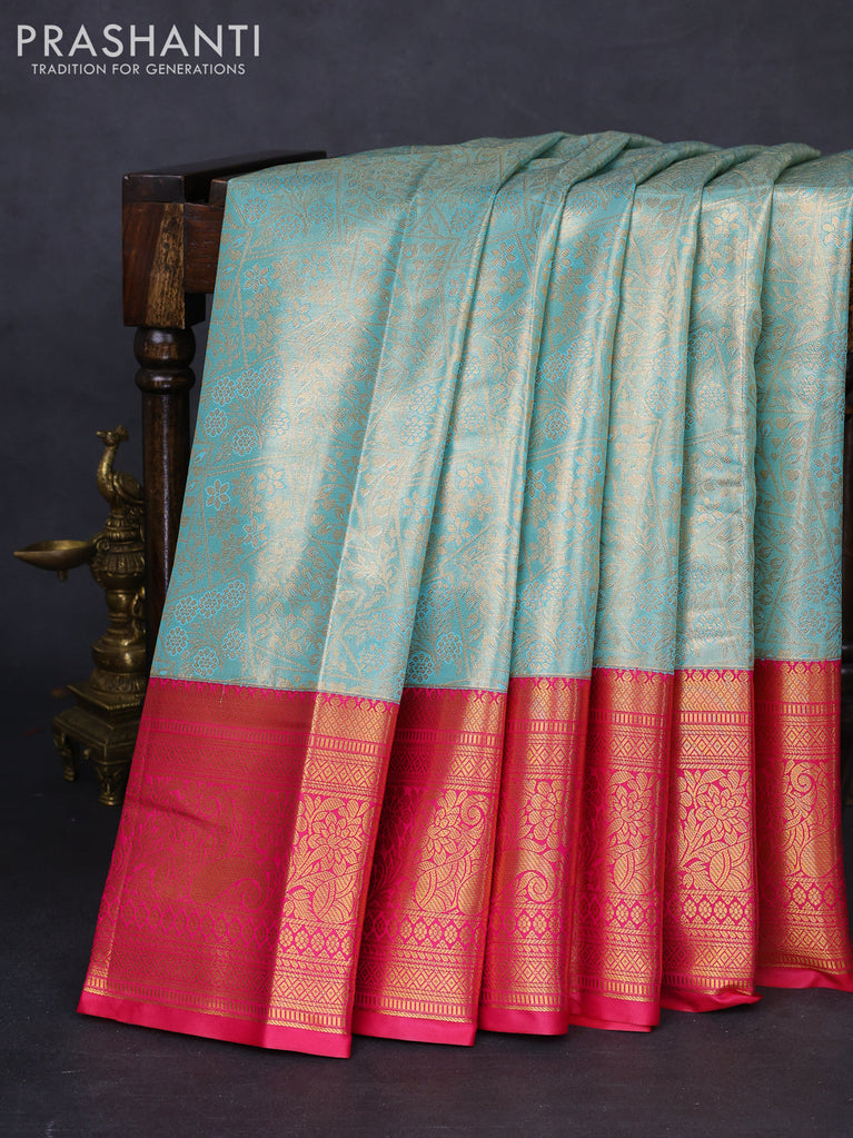 Bangalori tissue silk saree teal blue and pink with allover zari woven brocade weaves and long zari woven border