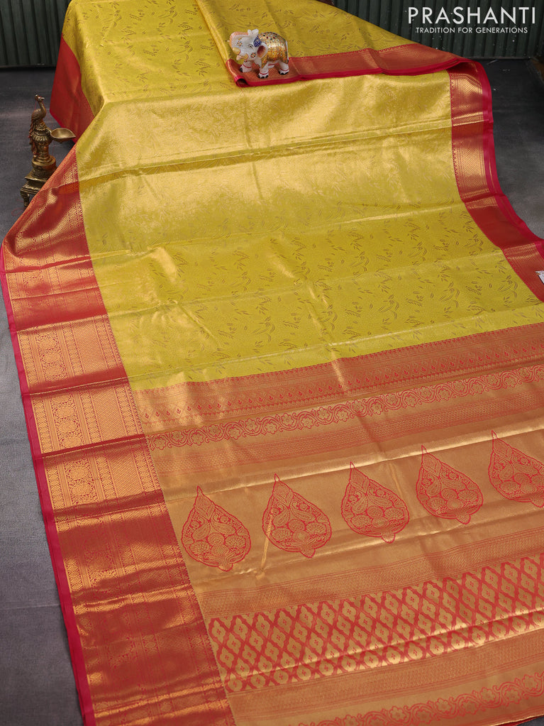 Bangalori tissue silk saree yellow and red with allover zari woven brocade weaves and long zari woven border