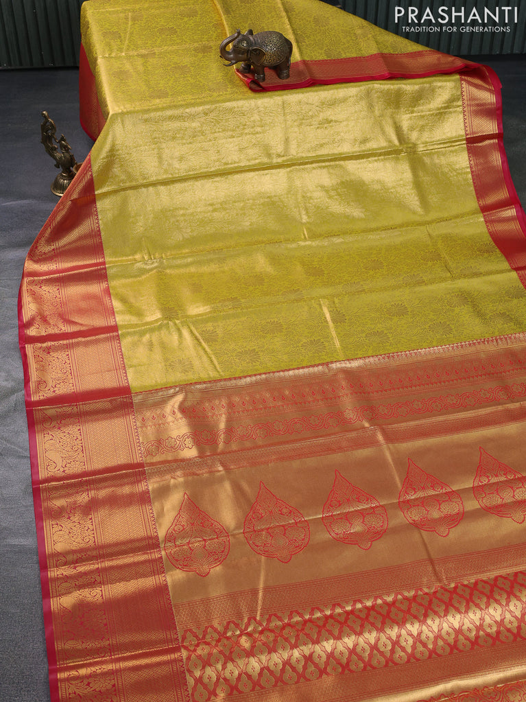 Bangalori tissue silk saree pista green and red with allover zari woven brocade weaves and long zari woven border