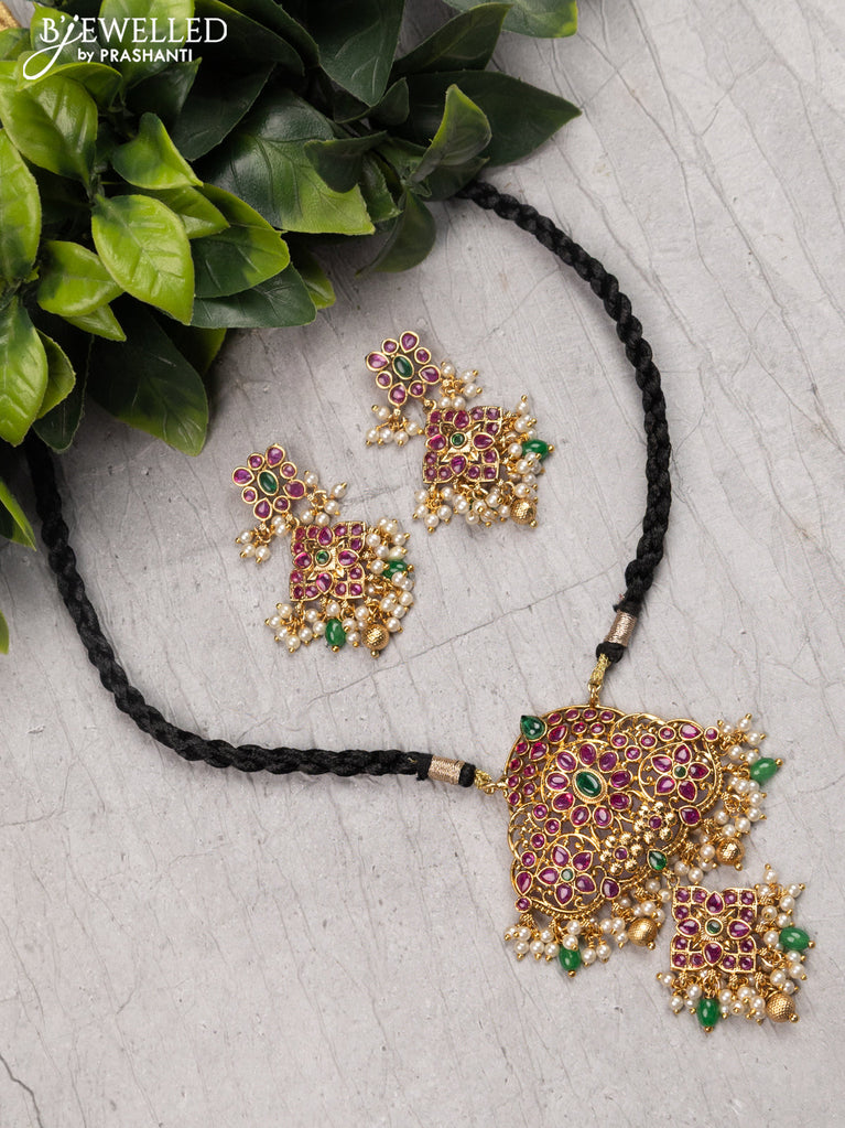 Black thread necklace ganesha pendant with kemp & cz stones and pearl hangings