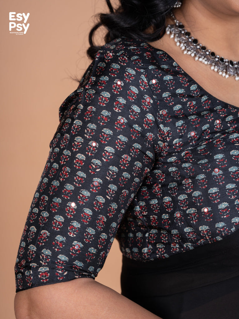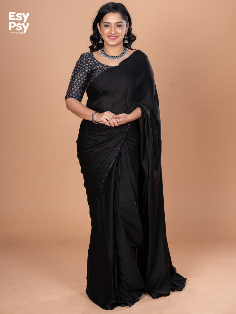 Black Satin Crepe readymade saree with readymade ajrakh printed blouse