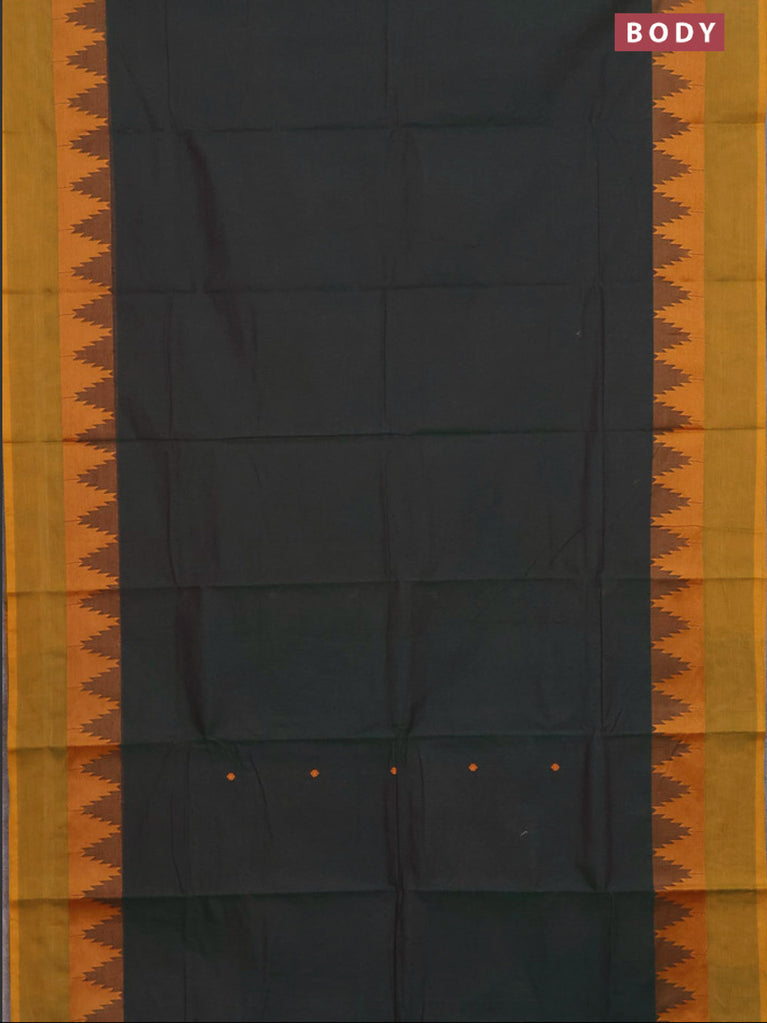 Chettinad cotton saree bottle green and dark mustard with thread woven buttas and temple thread woven simple border
