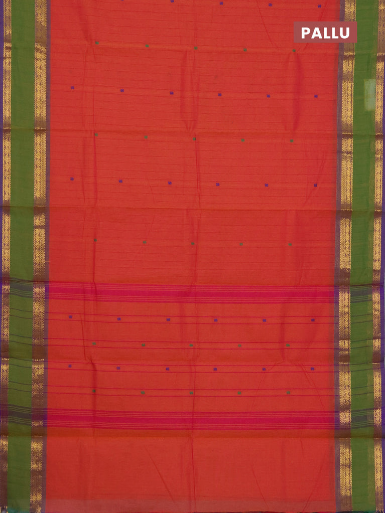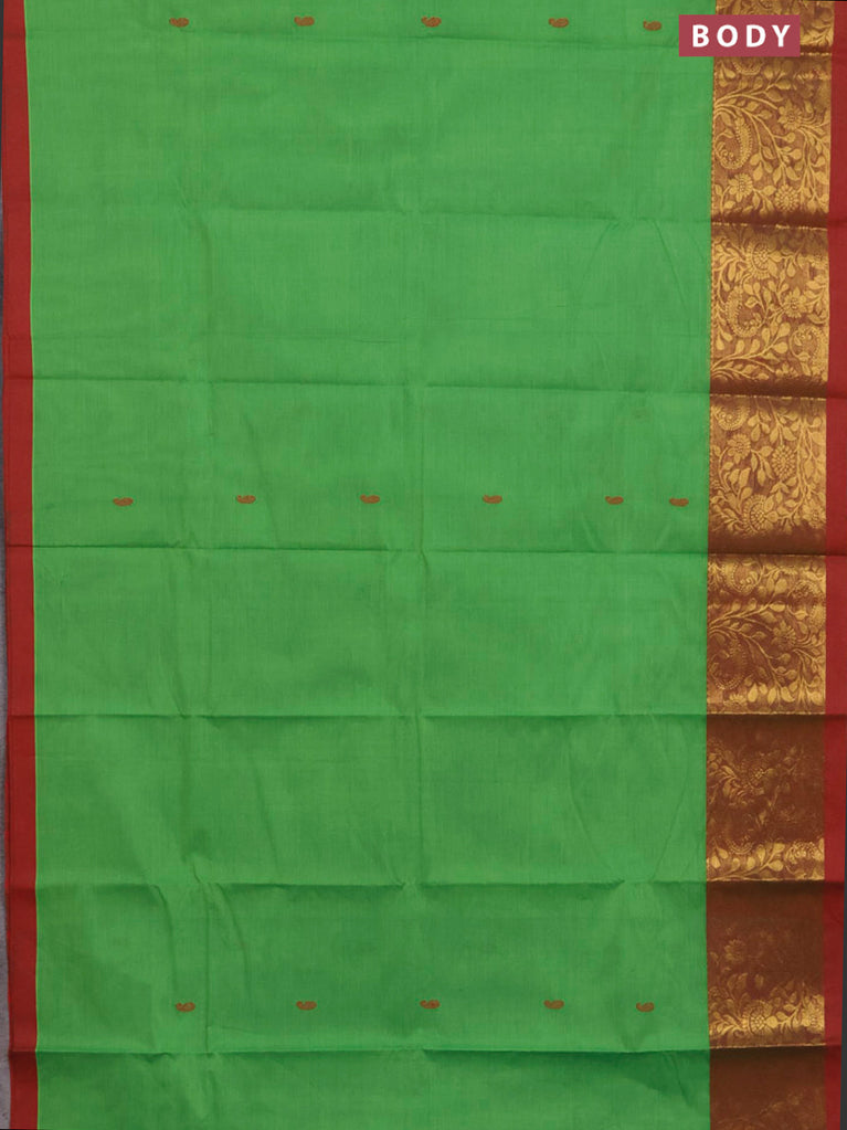 Chettinad cotton saree green and red with thread woven buttas and long zari woven border