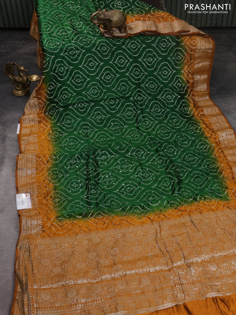 Chiniya silk saree green and mustard yellow with allover bandhani prints & zari weaves and zari woven border