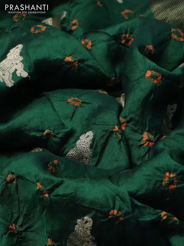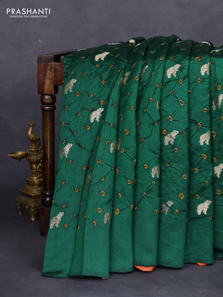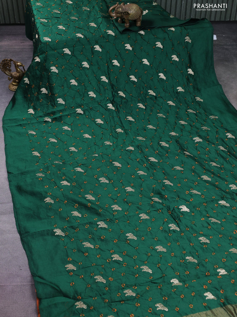 Chiniya silk saree green and orange with allover zari buttas & bandhini prints in borderless style