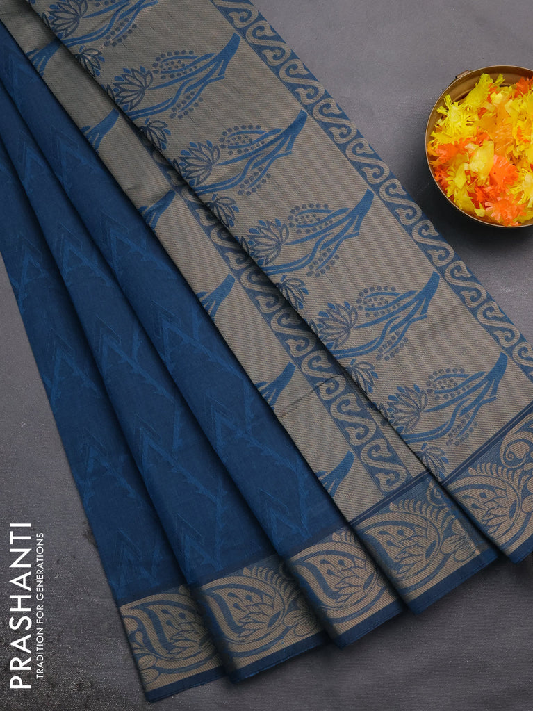 Coimbatore cotton saree peacock blue and sandal with allover self emboss and thread woven border