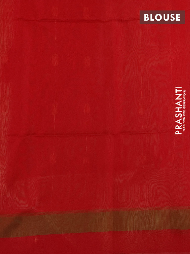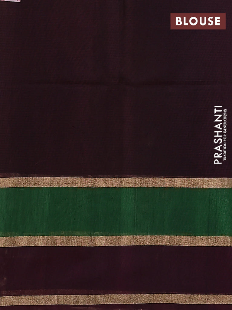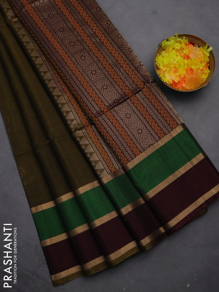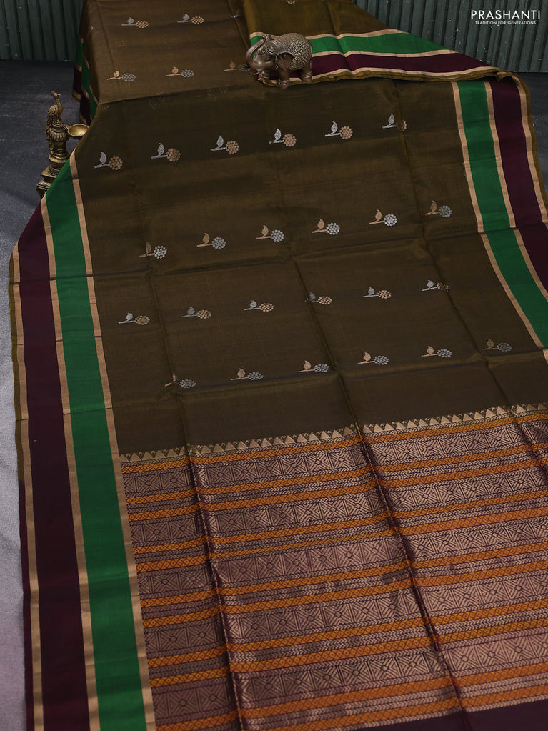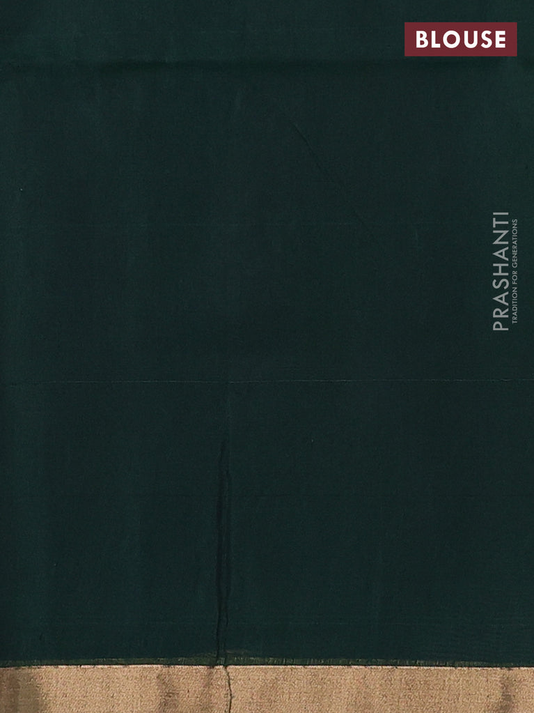 Kora silk cotton saree dark mehendi green and deep maroon with silver & gold zari woven floral buttas and long zari woven border