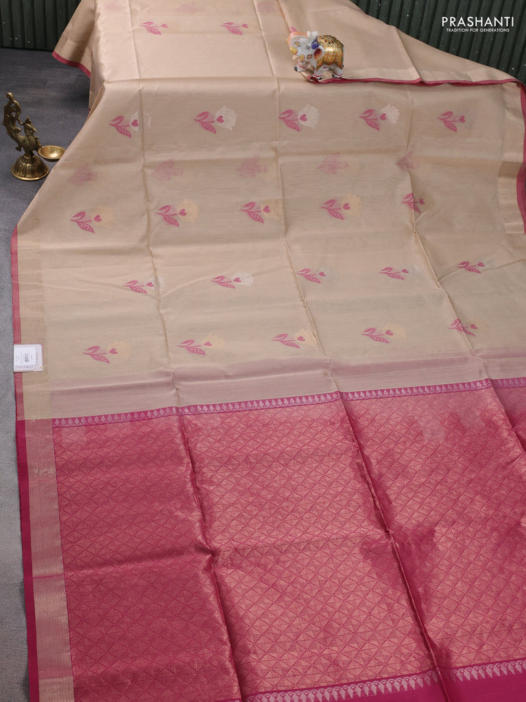 Kora silk cotton saree beige and magenta pink with thread & zari woven floral buttas and zari woven border
