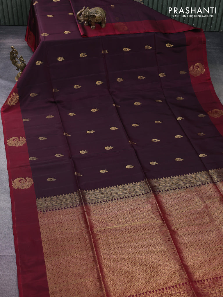 Kanchipuram soft silk saree wine shade and maroon with zari woven peacock buttas and zari woven butta border