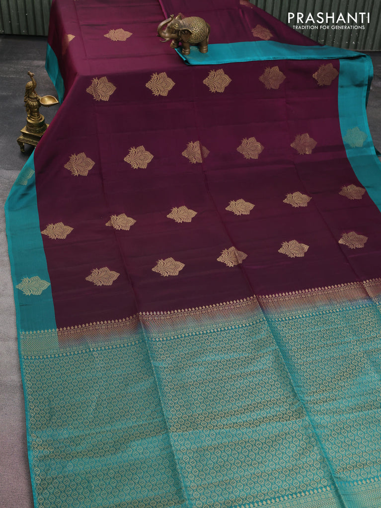 Kanchipuram soft silk saree wine shade and teal green with zari woven buttas and zari woven butta border
