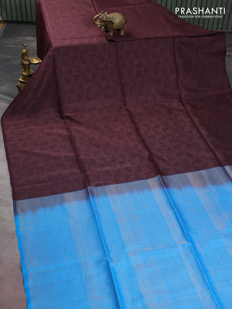 Kanchipuram soft silk saree wine shade and cs blue with allover zari woven brocade weaves in borderless style