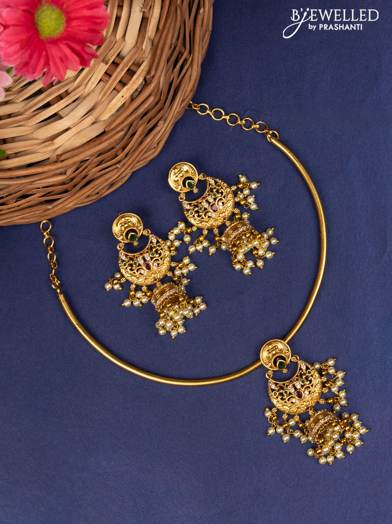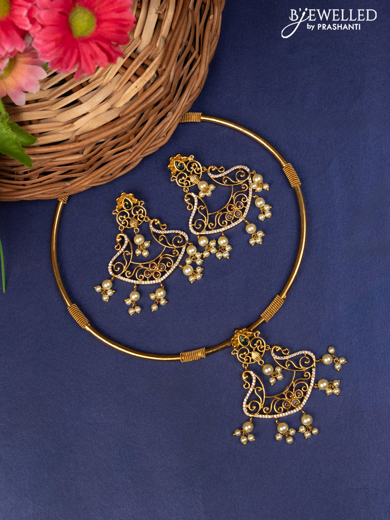 Antique ring type choker with kemp & cz stone and pearl hangings