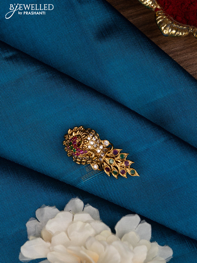 Antique saree pin kalasha & peacock design wih kemp and cz stones