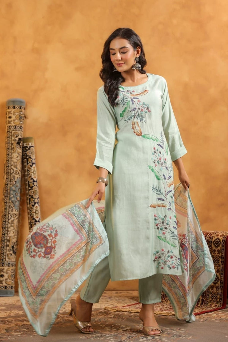Mustard Organza Saree with Mint-Blue Pearl Work Blouse & Digital Print