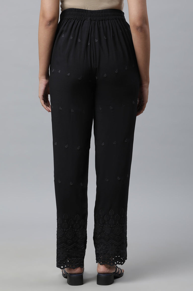 Black Schiffli Embroidered Straight Fit Woven Palazzo With Elasticated Waist
