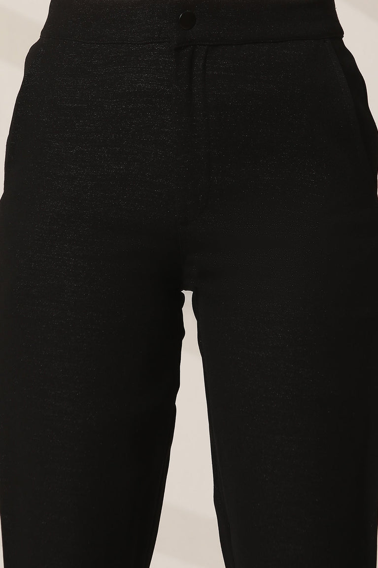 Crafted for the modern professional, these black slim-fit trousers combine style and comfort effortlessly. The knit fabric offers a soft hand feel and stretchability, ensuring all-day ease. Featuring functional front pockets and a front zip with button closure, these trousers are perfect for formal occasions. The elasticized waist belt adds a touch of convenience, making them easy to slip on. Pair them with a crisp shirt or a chic kurti for a polished look that transitions seamlessly from office to evening.