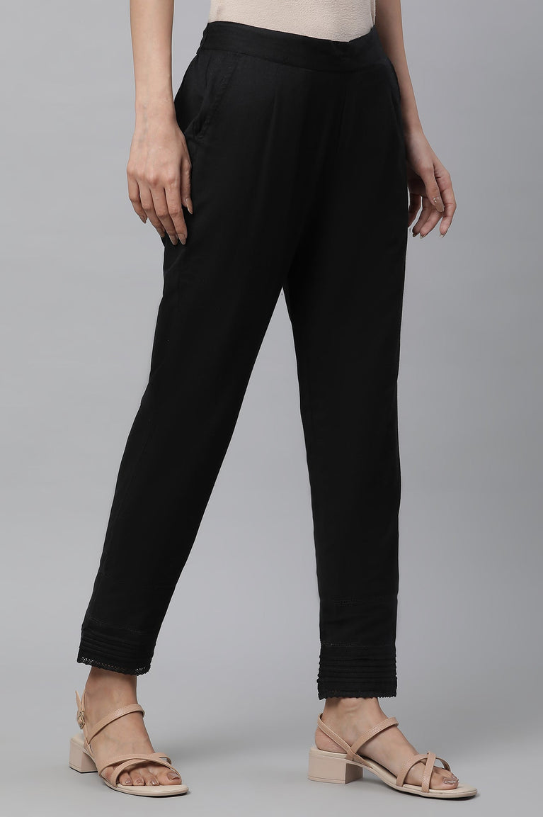 Black Solid Straight Fit Cotton Trousers With Lace Insert