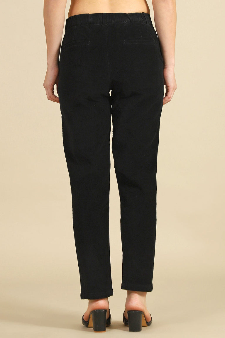 Black Solid Straight Fit Cotton Pants With Elasticated Back