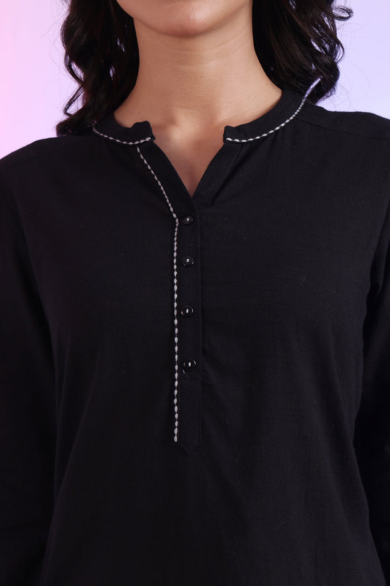 The kurta features a sophisticated band collar that leads into a neat, concealed button placket, maintaining the clean aesthetic. Its three-quarter sleeves provide graceful coverage, ending in a simple, unadorned hem. The yoke is intentionally plain, allowing the fabric's natural character and the garment's precise cut to take center stage. This solid tunic has no embellishments, focusing purely on beautiful form. A gently curved hemline with functional side slits ensures ease of movement and adds a soft, contemporary finish to the traditional straight shape. This opaque kurta is paired with classic salwar bottoms, a true icon of comfort that offers a relaxed fit before tapering elegantly at the ankle. This two-piece black salwar suit is a versatile foundation for any wardrobe, perfect for moments that call for quiet confidence.