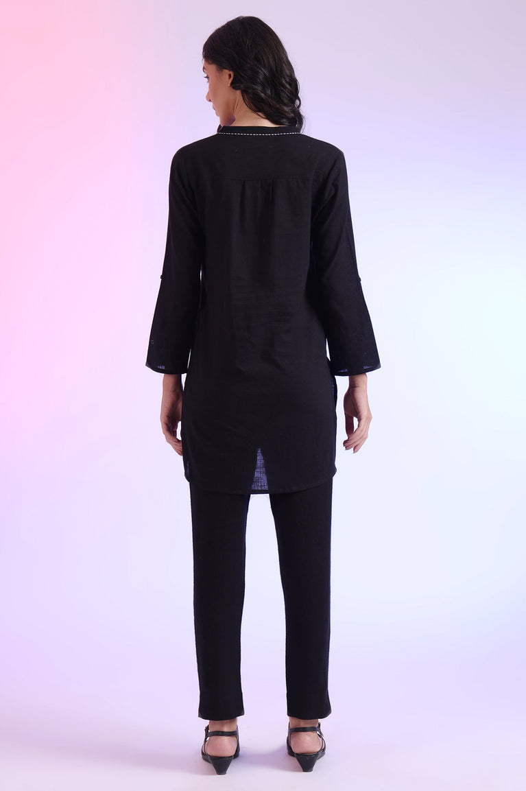 Some pieces speak in whispers, not shouts, and this is one of them. Crafted for the woman who finds power in simplicity, this stunning black kurta set for women is an ode to understated elegance. This perfectly coordinated ethnic co-ord set is fashioned from a breathable cotton slub fabric, offering a subtle texture and unparalleled comfort for all-day wear. Its straight silhouette glides effortlessly, creating a look that is both timeless and poised. This solid black cotton kurta set is a testament to minimalist ethnic wear.