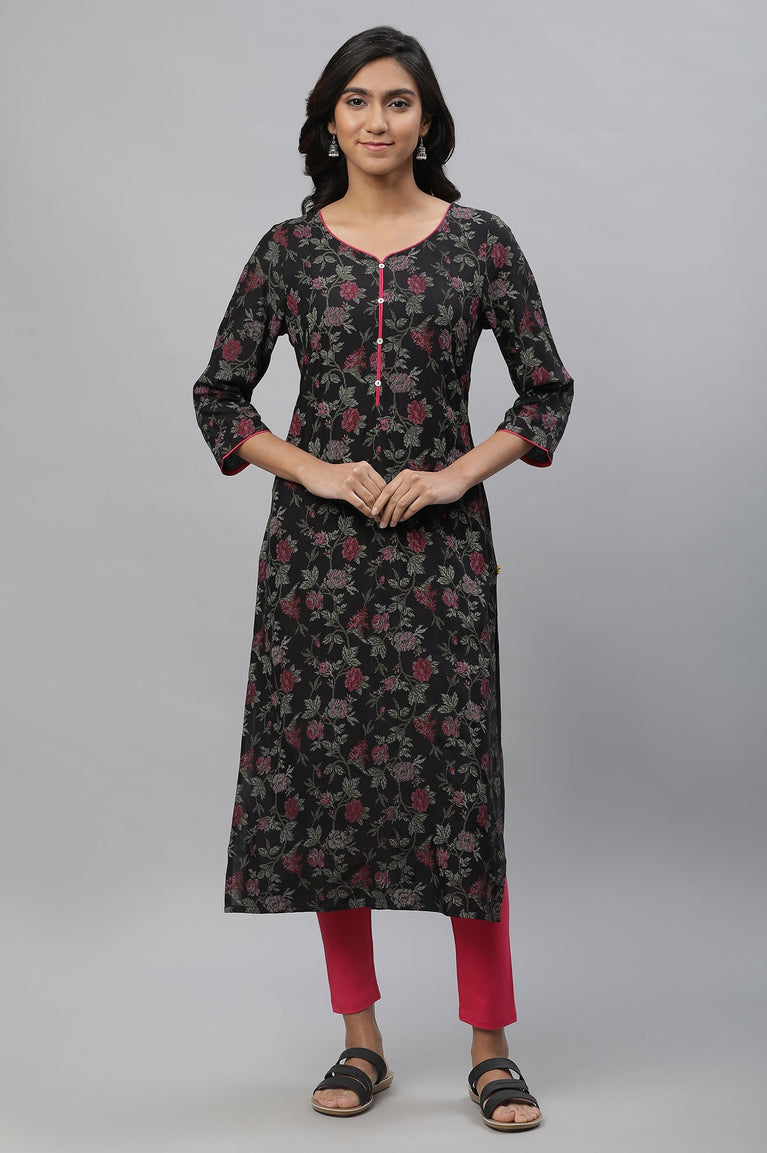 Black Viscose Tissue Straight Kurta with Embellished Neckline