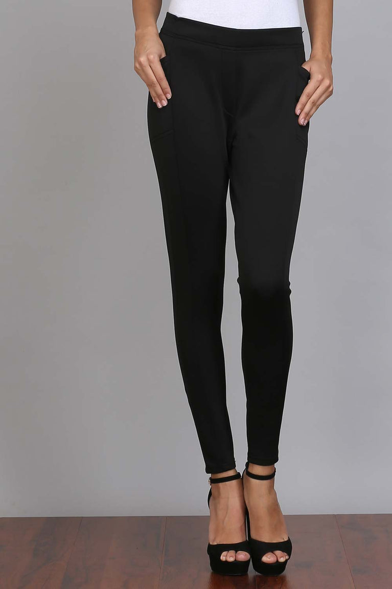 Stay comfortable and look stylish in these winter tights. Black interlock solid tights in ankle length and mid-rise.