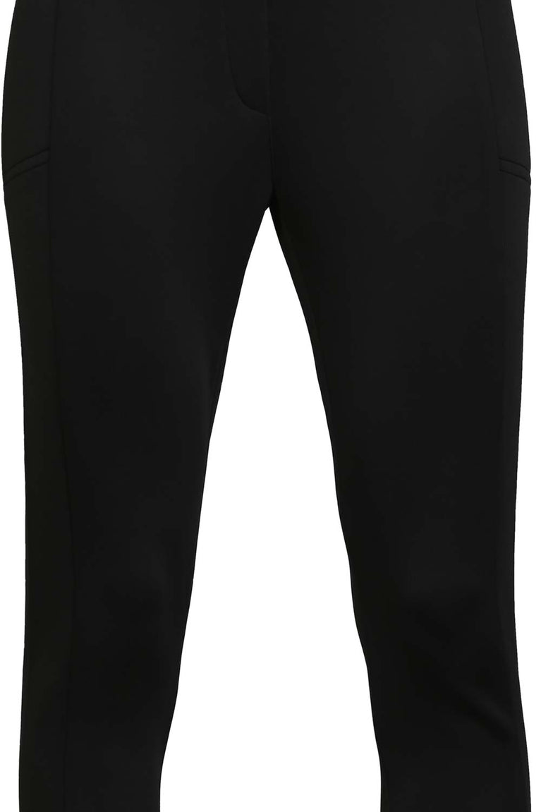 Black yarn dyed slim pants with embroidered hem in mid-rise with zip and side button.