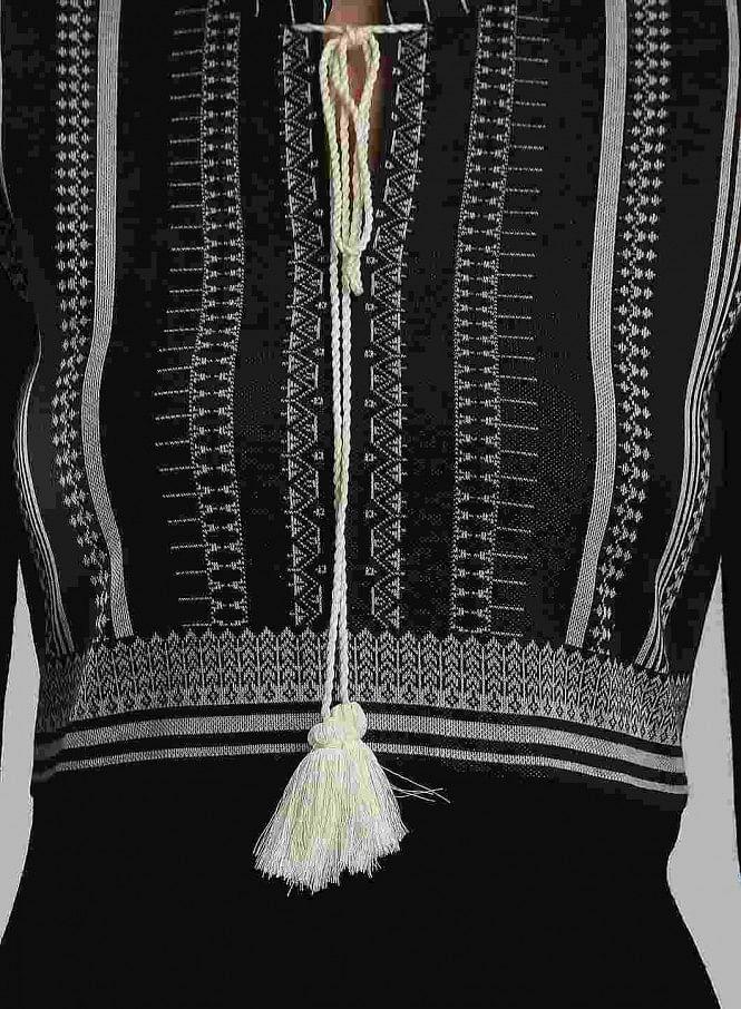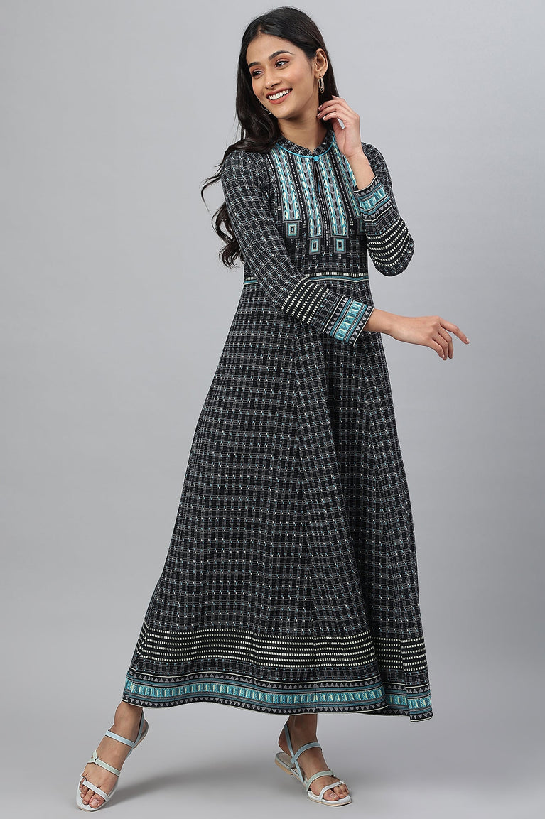 Keep yourself warm and comfortable by putting on this floor length dress. It features a fine geometric design on the yoke, a mandarin collar and full length placement sleeves.