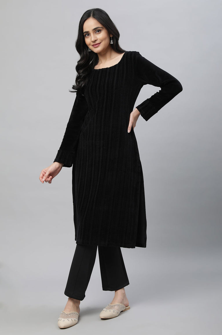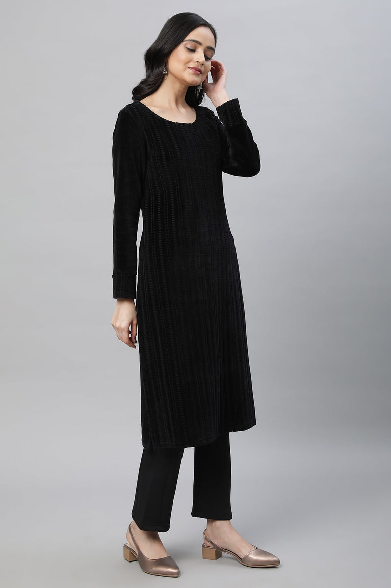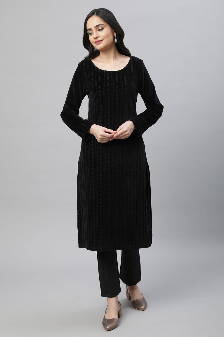 This elegant straight kurta in classic black is designed with a stylish Mandarin collar and a placket for a refined look. The 3/4th sleeves add to its timeless appeal, while the yarn-dyed fabric ensures both comfort and durability. Perfect for any occasion, this kurta offers a versatile and sophisticated addition to your wardrobe.