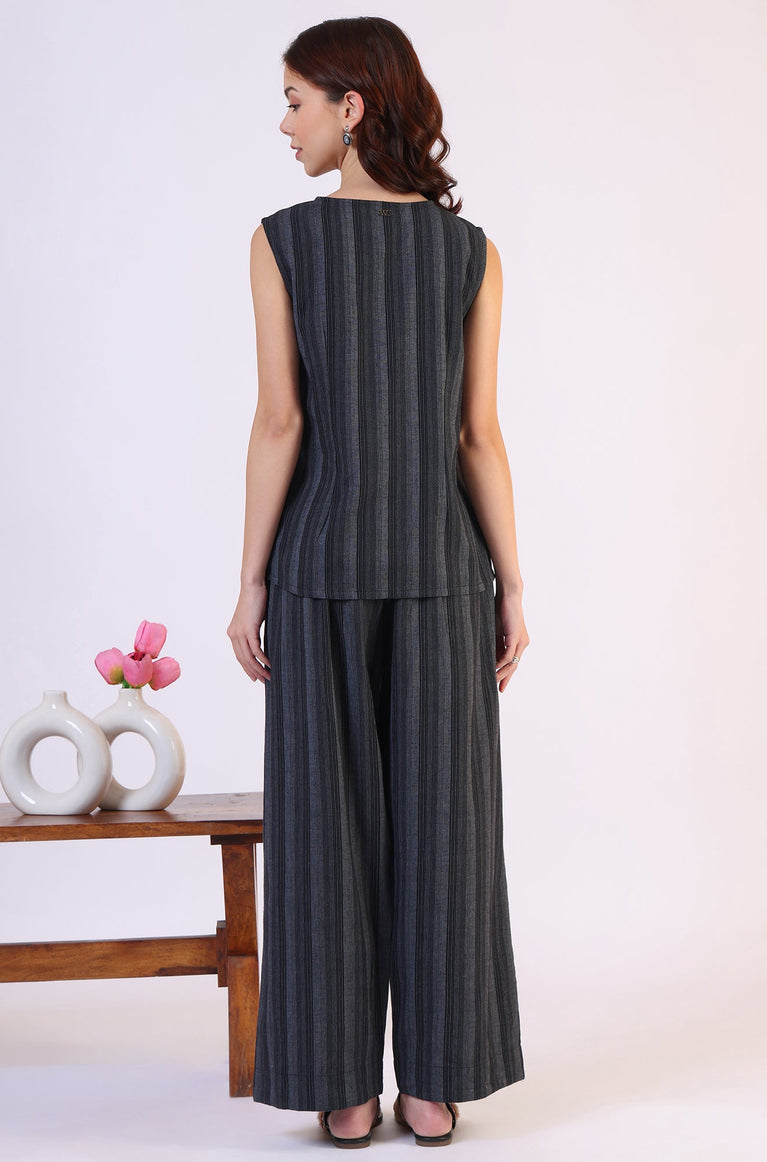 Black Yarn Dyed Striped Sleeveless Top and Pants Co-ord Set