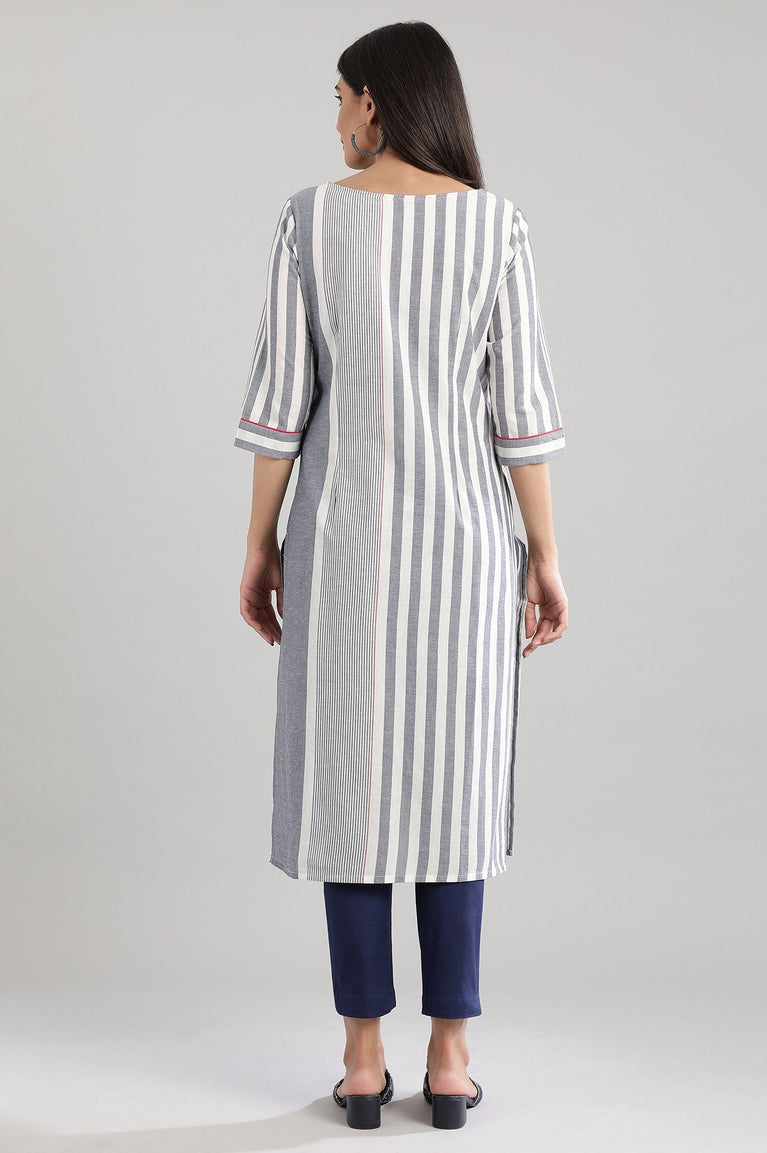 Denim Blue Printed A-Line kurta In Chambray With Side Seam Pockets And Contrast Stitch Line Detail On The Sleeves.