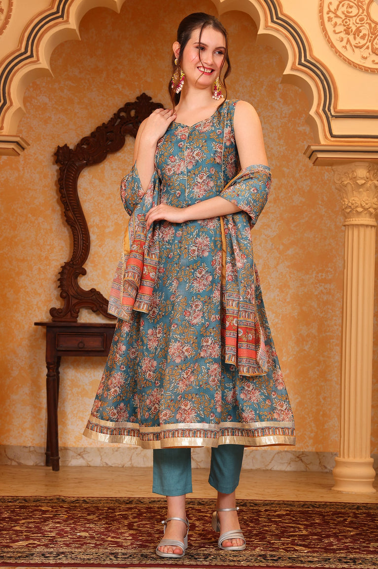 Blue Bold Floral Printed Pure Cotton Flared Kurta, Straight Pants and Dupatta Set