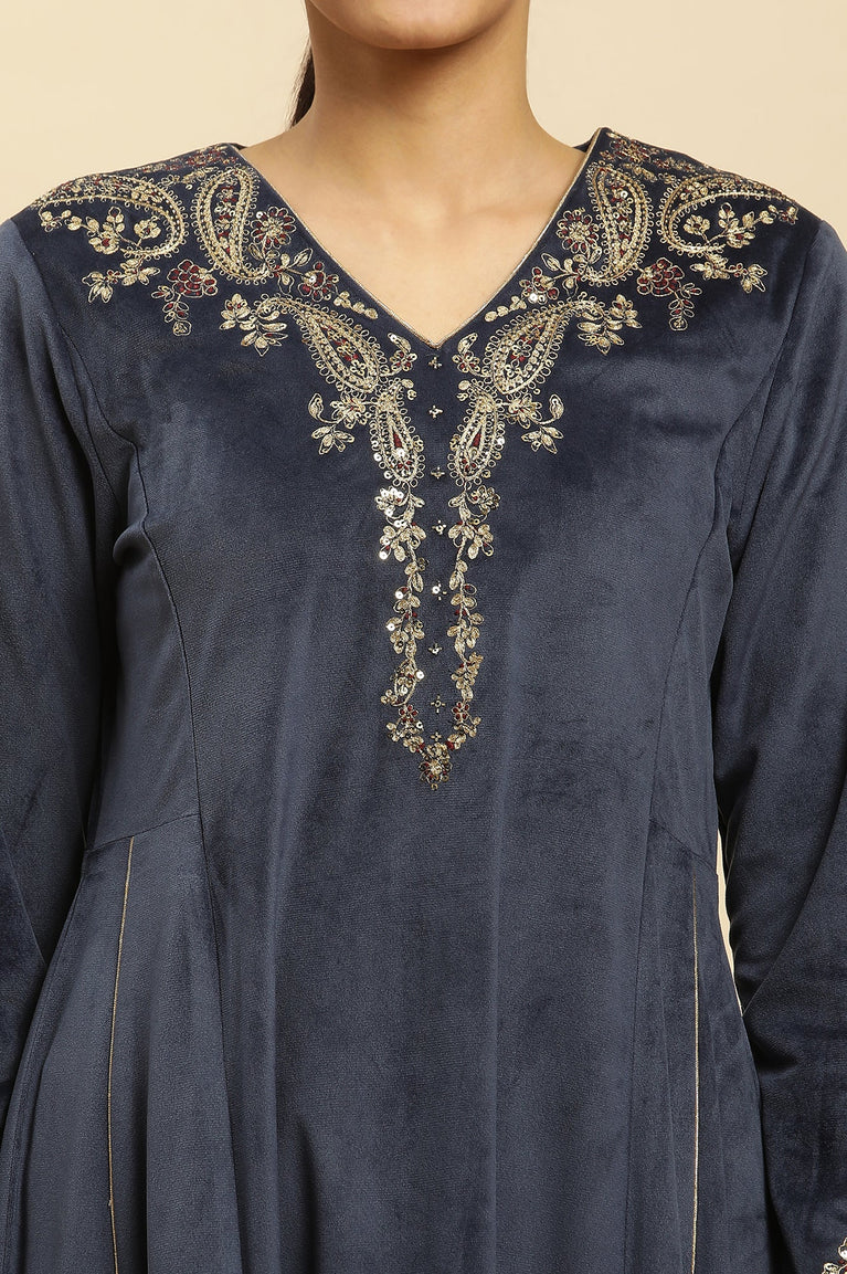 A Navy Blue Flared Festive Long Kurta In Velvet, Features Elaborate Dori Embroidery In Gold And Accented With Sequins Highlights. It Has Engineered Embroidery On Sleeves Aswell.