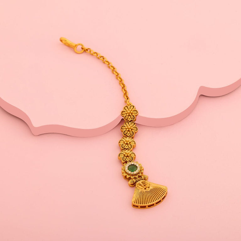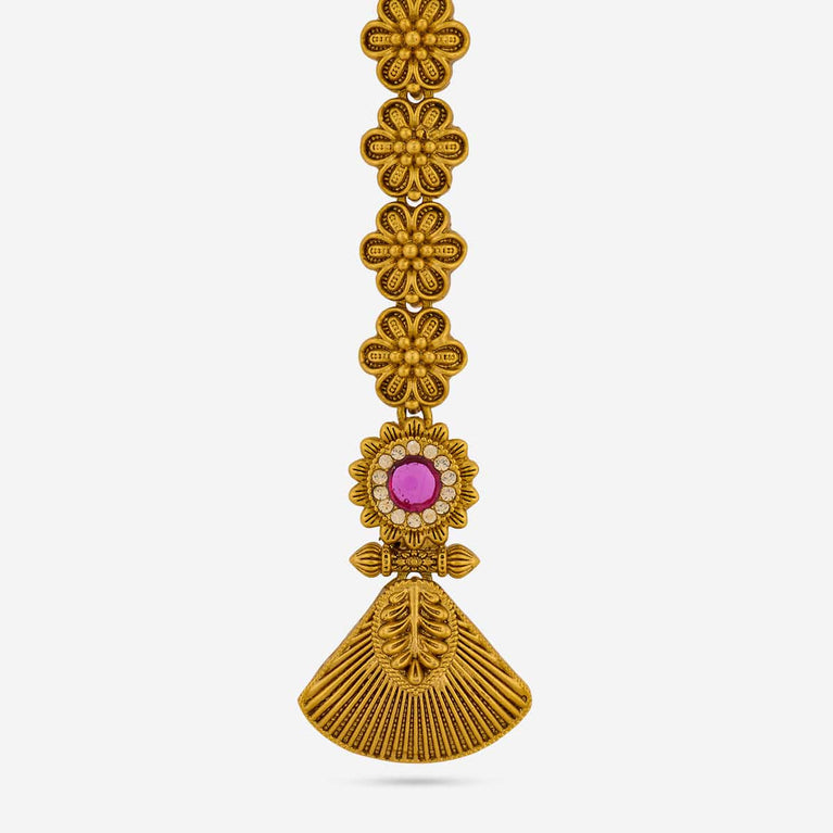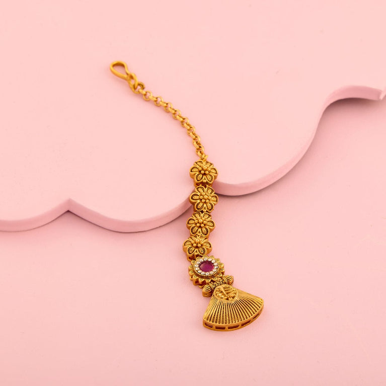Antique Zirconia Stone Maang Tikka With Ruby Beads