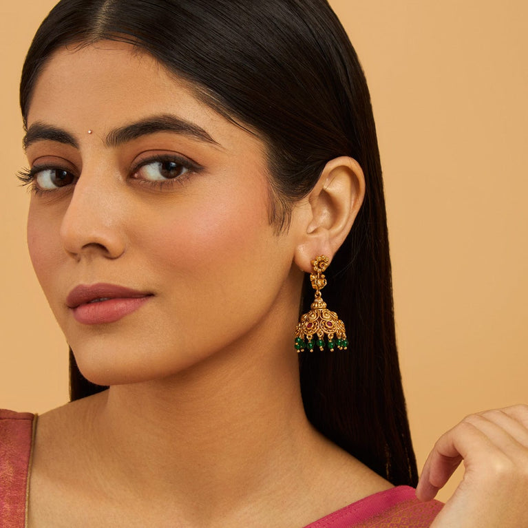Flower Design Antique EarringMake your outfits look better than ever with these earrings. The antique earrings are designed with ruby-coloured stones set against a gold-tone polish, creating a timeless appeal. The detailing complements the vivid hues of the stones, making them ideal for festive occasions or traditional attire. Pair these earrings with your festive kurtas for a sweet, feminine look.