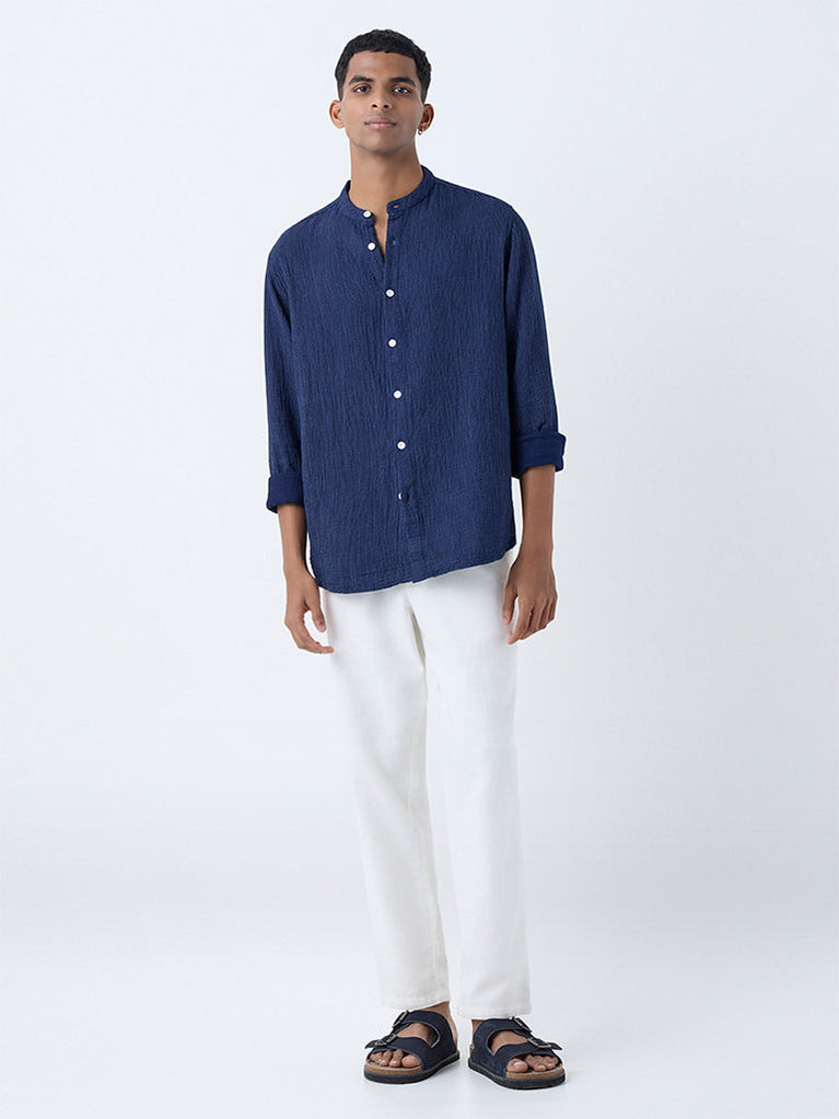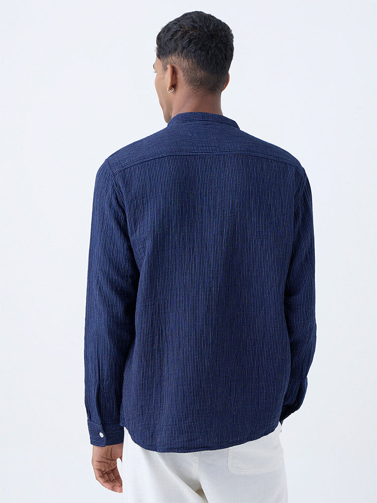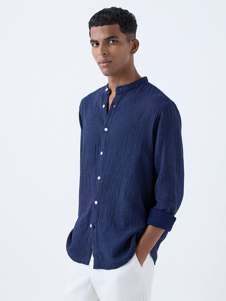 Embroidered with stripe patterns, this indigo shirt from ETA offers a refined yet casual appeal for warm-weather dressing. Spun from a cotton-rich fabric in a relaxed silhouette, it is styled with a mandarin collar, button placket, and half sleeves for everyday comfort.