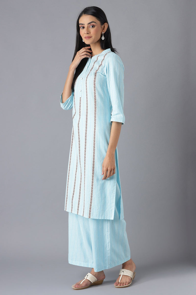 Blue Embroidered Seer Sucker Straight Kurta, Palazzo and Dupatta Set