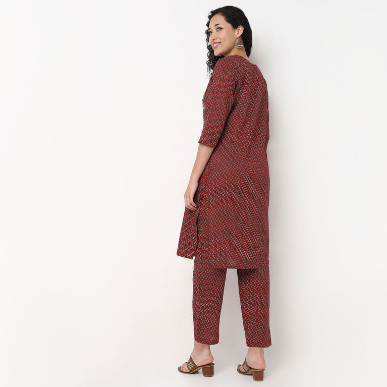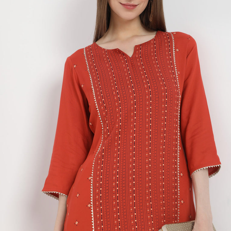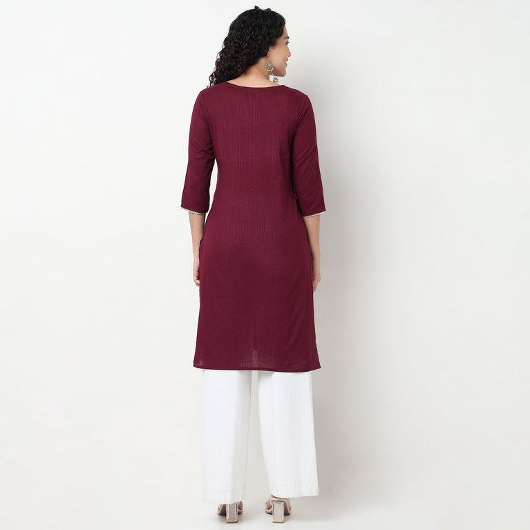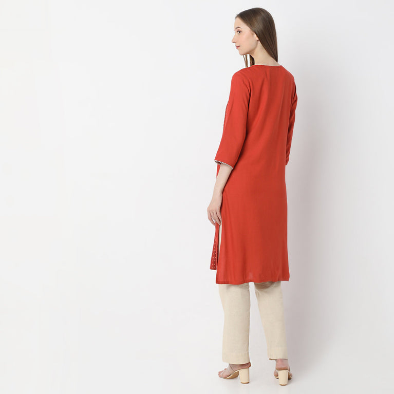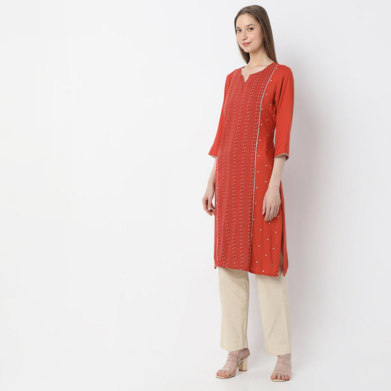 Make a statement at your next special occasion with this exquisite caramine pink kurta from Aurelia. This mid-calf length piece is a perfect blend of tradition and modernity, ideal for the fashion-forward woman. Crafted from 100% polyester, this kurta offers both comfort and durability. The round neckline adds a touch of elegance, while the three-quarter sleeves provide a classic look. What sets this kurta apart are its stunning embellishments - foil and sequin details that catch the light and draw attention. The straight cut of the kurta creates a sleek silhouette, while the side slit adds a contemporary twist and ease of movement. The woven construction technique ensures the kurta maintains its shape wear after wear. This fusion-inspired piece is perfect for special occasions, allowing you to stand out with its unique design. The vibrant caramine pink color is sure to turn heads and complement a variety of skin tones. Aurelia's attention to detail is evident in every aspect of this kurta, from the carefully chosen fabric to the intricate embellishments. Whether you're attending a wedding or a festive celebration, this kurta will ensure you look and feel your best throughout the event.